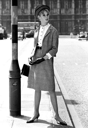 Jean Shrimpton wearing a suit, photo John French. London, UK, 1962