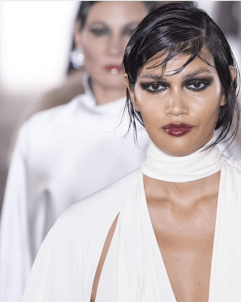 Think of it as the little black dress of this season’s beauty. Not matte, not glossy—just that perfect satin balance. On the runway, it looked luminous, sophisticated, and polished without being over the top.